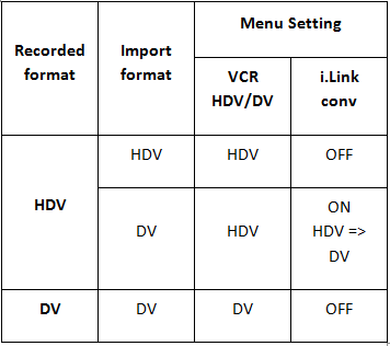 If your computer only has a 6 pin i link port then it will be necessary to use a 4 pin to 6 pin i link cable. Please check for other commercially available software that can support dv hdv video via i link ieeee1394 on your computer. Cmple 10ft firewire ieee 1394 cable ilink 6 pin to 4 pin male to male dv cable 4 pin to 6 pin firewire cable cord for computer laptop pc to jvc sony camcorder 10 feet black 4 4 out of 5 stars 25 firewire cable 9pin 4pin cable firewire 800 9 pin to firewire 400 4 pin for canon panasonic sony camera camcorder connect to apple imac 27. Select the required settings from the table below and make the menu settings.